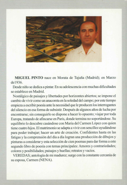 Los primeros pasos artísticos de Miguel Pinto fueron frecuentando exposiciones, tertulias y encuentros en medios culturales y artísticos. Sus amigos; José Luis Aguado y Angel Crespo son los que le empujan, aplauden para que se exprese con la poesía.